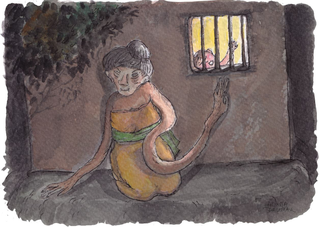 "That night, little Naocha wouldn't stop crying. Outside, Lai Khutsangbi chuckled to herself. Her mouth watered at the thought of devouring the rosy-cheeked child."