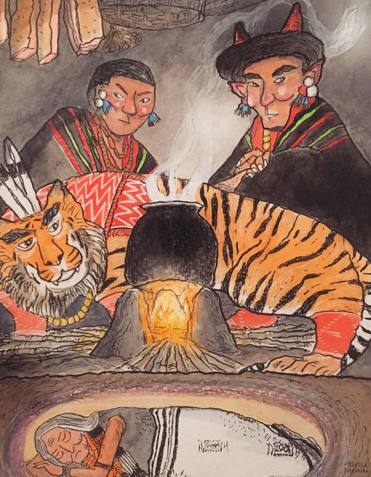 And it so happens that the mother passed away when her human son was with her. So that the tiger would not find their mother's body, man buried her under the hearth to camouflage the smell. Thus the tiger was unable to smell and find her body. Since then, humans have always been allowed to cook on the stove but not animals. This is also the reason why humans can even eat in the graveyard.